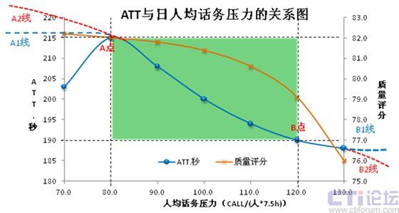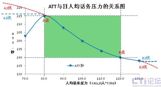所以,在其它影響因素穩(wěn)定的情況下,當人均話務壓力小于80或大于120的時候,ATT應該保持在這兩個壓力點對應的時長附近(即190~215秒,如A1和B1線走勢)我們暫且認為這是合理的波動范圍;若出現A2線走勢,浪費的必然是人員效率;若出現B2線走勢,犧牲的必然是服務質量。
