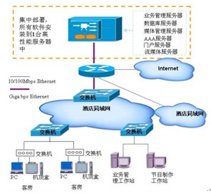 鄂州酒店級IPTV系統(tǒng)采用運(yùn)營平臺集中部署,中心運(yùn)營平臺涵蓋了中心媒體服務(wù)器,內(nèi)容管理服務(wù)器,門戶服務(wù)器,業(yè)務(wù)管理服務(wù)器,數(shù)據(jù)庫服務(wù)器,AAA服務(wù)器,網(wǎng)管服務(wù)器、視頻編碼器、流媒體服務(wù)器等,后期根據(jù)客戶量的增加,可以將多媒體服務(wù)器獨(dú)立出來進(jìn)行分布式的二層部署。