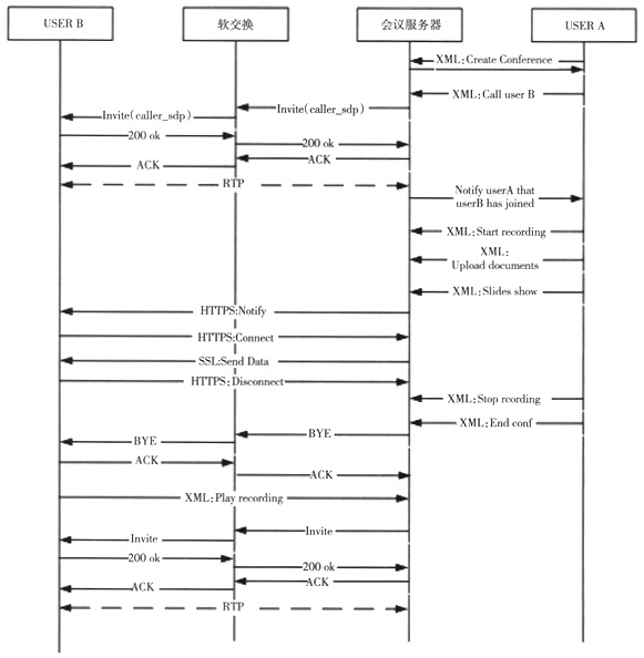 基于上述多媒體會(huì)議業(yè)務(wù)的實(shí)現(xiàn)流程,圖3給出了一個(gè)多媒體會(huì)議業(yè)務(wù)典型應(yīng)用的信令流程,具體包括對(duì)于用戶創(chuàng)建會(huì)議、邀請(qǐng)與會(huì)成員、會(huì)議中的,文件演示、會(huì)議的錄制與會(huì)議的回放等信令流程的描述。