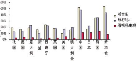 除打電話、發(fā)短信、拍照、手機郵箱以外,音樂、游戲也是用戶每周使用較多的業(yè)務。當被問及其它應用時,來自中國、新加坡還有韓國的部分被調查者表示,他們會經(jīng)常用手機來聽音樂和玩游戲。其中,中國是惟一一個選擇用手機聽音樂的用戶數(shù)與選擇用手機拍照的用戶數(shù)旗鼓相當?shù)膰摇5腥さ氖,手機在中國不太可能成為MP3的替代品,仍然只是一個便攜播放器。在新加坡,手機替代MP3的可能性就大多了。Ovum認為,這是由于高端手機在新加坡市場占有很高的比例。在歐洲和美國,使用手機來聽音樂和玩游戲的比例則比亞洲少了很多,但值得鼓勵的是仍有超過10%的被調查者選擇了該答案。(見圖2)