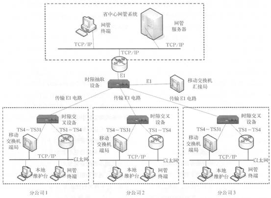 同樣以移動(dòng)網(wǎng)為例,例子中移動(dòng)交換機(jī)到維護(hù)終端支持TCP/IP方式,分公司具有本地維護(hù)終端和網(wǎng)管終端兩種類型的維護(hù)臺(tái)。本地維護(hù)終端通過以太交換機(jī)直接與移動(dòng)交換機(jī)相連;網(wǎng)元和網(wǎng)管終端通過以太網(wǎng)接入邊緣路由器,經(jīng)路由器接.el轉(zhuǎn)化以El方式接入到時(shí)隙抽取設(shè)備中,由于傳送網(wǎng)管信息占用帶寬較小,