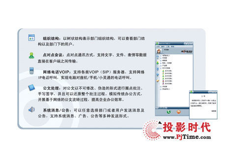 Center運(yùn)營架構(gòu)為基礎(chǔ),有效整合了企業(yè)的如電話、傳真、手機(jī)、短信、E-mail、即時通訊等各種常用的通信設(shè)備和媒體應(yīng)用,并進(jìn)行統(tǒng)一管理、計劃及協(xié)同,是一套集即時通訊、網(wǎng)絡(luò)電話、點對點會議、多方視頻會議、遠(yuǎn)程教學(xué)、遠(yuǎn)程監(jiān)控、組織結(jié)構(gòu)等為一體的桌面融合辦公系統(tǒng),能夠全面滿足企業(yè)遠(yuǎn)程的日常交流、會議培訓(xùn)、協(xié)同辦公、商務(wù)談判、指揮調(diào)度、安全保衛(wèi)等各種需求。