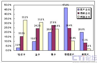 因?yàn)楦叨丝蛻粼诶麧?rùn)貢獻(xiàn)中所起的巨大作用,通過簡(jiǎn)單的計(jì)算即可得出,每一名鉆石卡客戶流失帶來(lái)的利潤(rùn)損失,相當(dāng)于9.4名銀卡客戶流失帶來(lái)的損失,或相當(dāng)于50名普通客戶流失帶來(lái)的損失,或相當(dāng)于125名新用戶流失帶來(lái)的直接損失。