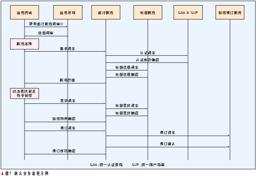 首先王先生的PDA通過歸屬網(wǎng)絡(luò)的業(yè)務(wù)發(fā)現(xiàn)服務(wù)器獲得旅行服務(wù)的主頁列表,他選擇一家訪問其旅行服務(wù),旅行服務(wù)通過其歸屬網(wǎng)絡(luò)的GAA&GUP對該終端進行認證以及提供旅行服務(wù)的授權(quán),成功后,旅行服務(wù)向地圖服務(wù)請求地圖信息并隨服務(wù)頁面一齊返回給終端,王先生點擊查找“離我最近的中餐館”按鈕,旅行服務(wù)將請求代理轉(zhuǎn)發(fā)給地圖服務(wù),后者返回中餐館列表(用戶的位置信息可以由用戶上報,或者由旅行服務(wù)查詢用戶歸屬網(wǎng)絡(luò)的位置服務(wù)獲得),旅行服務(wù)轉(zhuǎn)發(fā)給終端,當王先生選擇一個中餐館并預訂時,旅行服務(wù)調(diào)用該餐館的預訂服務(wù),訂單傳給相應(yīng)服務(wù)人員,流程完成。