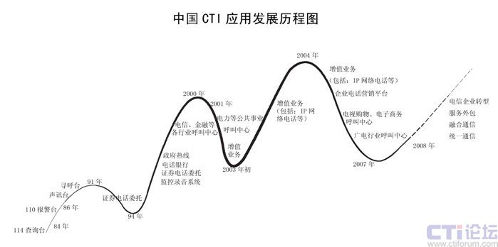 CTI在中國已經(jīng)發(fā)展了二十多年,已經(jīng)從最早的電信行業(yè)CTI應用發(fā)展到金融(包括銀行、保險、證劵及基金)、電力、郵政、企業(yè)(包括煙草、汽車、家電、IT、互聯(lián)網(wǎng)、旅游、報業(yè)、航空、物流、醫(yī)療、公共事業(yè)等)、政府、軍隊等各行各業(yè)的應用。特別在1995年到2001時期,是CTI應用發(fā)展最快,普及面最廣的時期,也是CTI市場進入了第二次高潮;從2002開始增值業(yè)務是整個CTI行業(yè)的突破口,整個行業(yè)以增值業(yè)務為主,CTI市場進入了第三次高潮;從2006年開始,增值業(yè)務進入了衰退期,整個CTI行業(yè)市場出現(xiàn)了嚴重的危機,加上新的技術出現(xiàn),技術的換代,對原來的傳統(tǒng)語音產(chǎn)品和公司是個致命的打擊。