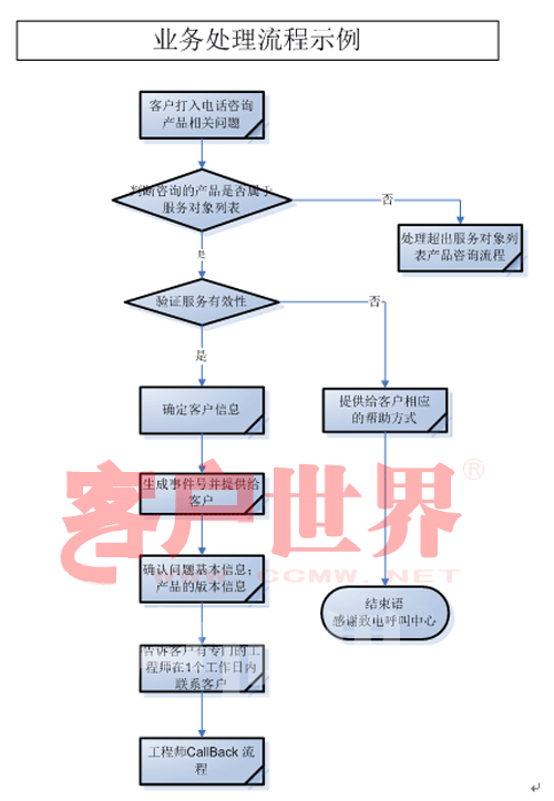流程建設(shè)往往包含以下內(nèi)容:   業(yè)務(wù)處理流程:是一個流程體系。它描述了呼叫中心如何為客戶提供服務(wù)的詳細(xì)步驟。從座席處理每一個交易開始(例如接聽電話,接受電子郵件,進(jìn)行網(wǎng)上聊天聯(lián)系等)到交易的結(jié)束,所有動作都受業(yè)務(wù)處理流程所指導(dǎo)。