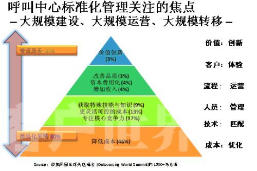 那么,對于這個尚處在”嬰兒潮”時期的產(chǎn)業(yè),我們最應(yīng)該做些什么來呵護(hù)和培育這個產(chǎn)業(yè)健康有序的發(fā)展?大家要好好呵護(hù)這個行業(yè)。如果只是強(qiáng)調(diào)“要想讓呼叫中心發(fā)展,那就需要我們多投錢,這樣就能買許多機(jī)器,放在公司里面。規(guī)格有了,那呼叫中心就發(fā)展了!蔽矣X得這樣的說法是對呼叫中心發(fā)展的錯誤理解。我們這個標(biāo)準(zhǔn)是希望營建專業(yè)化的產(chǎn)業(yè),整個呼叫中心產(chǎn)業(yè)的價值金字塔,這個金字塔每年在美國有一個專場,就叫呼叫中心專場,標(biāo)志一個產(chǎn)業(yè)成熟的金字塔是怎樣的。通過調(diào)查發(fā)現(xiàn),當(dāng)產(chǎn)業(yè)進(jìn)入成熟階段,標(biāo)準(zhǔn)化服務(wù)的第一個就是降低成本,也就是提高生產(chǎn)效益,能夠把這個產(chǎn)業(yè)細(xì)化分解,高度的模塊化進(jìn)行精細(xì)控制的時候,其他的差異化的體現(xiàn)。呼叫中心本身是不是成為企業(yè)核心競爭力的一部分,或者說越來越成熟的外包商出現(xiàn),能夠把一些企業(yè)非核心競爭力加入到自己的核心競爭力之上,這叫專業(yè)化。還有一個更加靈活可控的成本,呼叫中心的彈性從一百人到一千人,一千人到三千人的發(fā)展更加可控。還有獲得特殊技能與知識,事實上呼叫中心各行各業(yè)知識都會接觸,你只有專著才能做得更好,本身對于呼叫中心的從業(yè)人員來說,在這個產(chǎn)業(yè)中扮演的角色不是締造一個企業(yè)的核心競爭力,怎么期望從業(yè)人員掌握更多的技能和知識,來指導(dǎo)更多的行業(yè)和企業(yè)。特別是在客戶導(dǎo)向上面的發(fā)展,還有在金字塔上面增加收入,分析客戶所需,讓我們更好的滿足客戶的需求;然后資本費用化,從外包專業(yè)化領(lǐng)域帶來的變化,很多的時候最大的一筆建設(shè)是呼叫中心,基本一個中等的呼叫中心沒有500萬以上的資金投入是不可想象的。