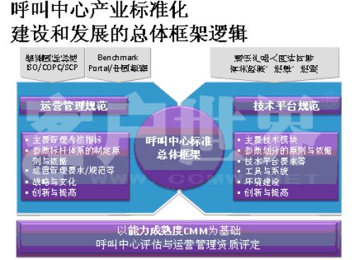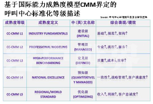 Markets)呼叫中心產(chǎn)業(yè)深入研究相結(jié)合的成果。。我在前幾年企業(yè)實施標(biāo)準(zhǔn)的時候深入研究了這套模型,這套模型對我們呼叫中心產(chǎn)業(yè)有極大的適用性,幾乎每個呼叫中心都可以在這套模型找到定位,從一個渾沌的初始過程到管理者,如果能夠建設(shè)一個持續(xù)的管控的流程到定義級,如何進(jìn)行一致化管理,再到預(yù)知級,幾乎每個呼叫中心從大到小,從年輕到發(fā)展一段時間都可以找到自己的定位,所以我們在原來的信息產(chǎn)業(yè)指導(dǎo)委員會的支持下,我們重新結(jié)合CMM模型開發(fā)出了符合我們呼叫中心發(fā)展的一個標(biāo)準(zhǔn),我建議大家把它看成是一個模型,整個國際產(chǎn)業(yè)都定性了標(biāo)準(zhǔn),因為大家都知道CMM模型是一個開放性的知識體系,并不是一個封閉標(biāo)準(zhǔn)。CMM模型,首先你的呼叫中心建設(shè)要能夠符合呼叫中心的定義,不是找?guī)着_話機(jī)或?qū)ν庥袀一個客服號碼對外就能稱為呼叫中心。