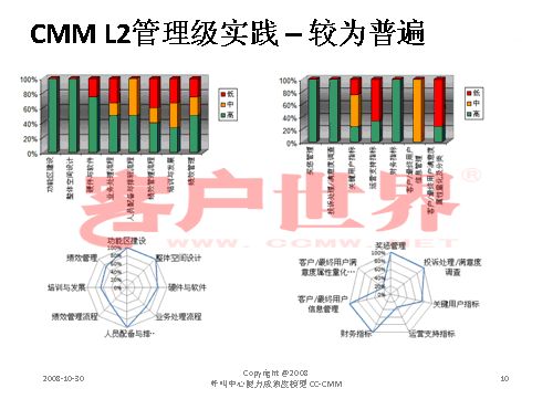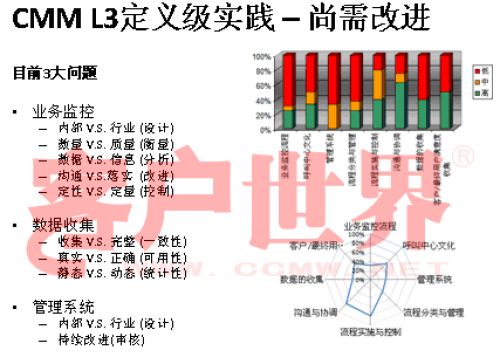 接下來我用一個很小的案例結(jié)束今天的分享,我們整個的呼叫中心的成熟度模型目前是在電信行業(yè)開始了2008年版的推廣,成熟度模型經(jīng)歷從07年成立亞太呼叫中心產(chǎn)業(yè)聯(lián)盟以后,由一群這個行業(yè)里面的專家,特別是中國產(chǎn)業(yè)市場的發(fā)展建立起的標(biāo)準(zhǔn),一年以來在通信行業(yè)我們做的能力成熟度的判定有一些很有意思的啟示,通信行業(yè)占到我們整個呼叫中心產(chǎn)業(yè)約70%的坐席,是最大的、最有代表性的產(chǎn)業(yè)。做下來真的很有代表性,普遍性在于環(huán)境建設(shè)、資產(chǎn)投入、資產(chǎn)配置,所以這下面的雷達(dá)就可以看到,相對完善都是在環(huán)境建設(shè),功能區(qū)建設(shè),整體空間設(shè)計、硬件相對來說比較偏硬的一些。在其他方面偏廢的比較厲害。第二個雷達(dá)在一些獎懲管理、信息管理,整個軟性方面幾乎有很濃重的一些計劃經(jīng)濟(jì),制造行業(yè)的一些領(lǐng)域相對來說比較成熟。我們目前看到的,基本上通信行業(yè)的一些發(fā)展在能力成熟度上是二級到四級,尤其以二到三級的發(fā)展更為普遍。通常的方法為期一周的標(biāo)桿調(diào)研,看所有的呼叫中心發(fā)展的五個方面,我們才會在里面做這樣的判定。在能力成熟度的三級,我們做了一些企業(yè)發(fā)現(xiàn),特別在三級,關(guān)于能不能對流程進(jìn)行一致性管理方面,就是剛才李老師講到的不是最急的,而管理是最重要的?赡芩械牧鞒潭喽嗌偕儆幸恍┏墒於鹊膯栴},但是我們的源頭流程能力在三個方面有很大的差距:一個是業(yè)務(wù)監(jiān)控流程,第二個數(shù)據(jù)收集流程,還有一個是管理系統(tǒng)的審核流程。這個大家可以和自己的呼叫中心比一比。