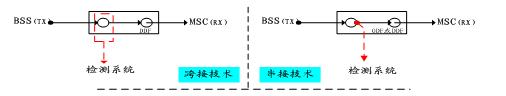 目前在GSM網(wǎng)信令檢測領(lǐng)域,主要應(yīng)用的措施有跨接技術(shù)、串接技術(shù)兩種。其圖示如下: