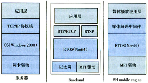 軟件平臺(tái):SH-7300實(shí)時(shí)操作系統(tǒng)(Norti4),MPEG-4audio/videoencoder/decodermiddleware,流媒體協(xié)議棧(如圖2所示)。