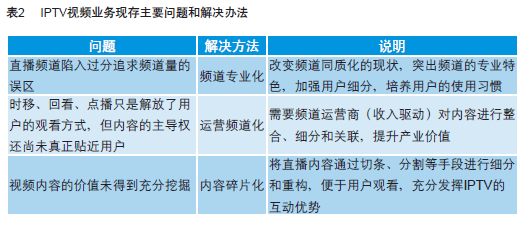 IPTV發(fā)展中,傳統(tǒng)視頻業(yè)務(wù)既是切入點(diǎn),也是業(yè)務(wù)收入的重要來(lái)源。但目前視頻業(yè)務(wù)的價(jià)值還未得到充分體現(xiàn),互動(dòng)性優(yōu)勢(shì)還未得到充分挖掘。主要問(wèn)題和解決辦法如表2所示。