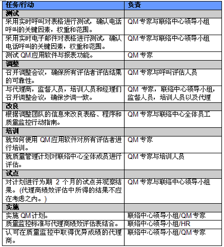 4. 開展項目交流。管理人員必須就新的或者修繕后的QM計劃與代理商進(jìn)行交流。QM的成功與否與代理商的合作密不可分,如果代理商受邀參與新QM計劃的開發(fā)并且所有改變都在雙方之間明確交流過,那么成功的機(jī)會也將大大提高。交流的內(nèi)容應(yīng)包括為什么要開發(fā)這樣一個計劃,它的作用和職責(zé)是什么,它對代理商會產(chǎn)生哪些影響(對于他們的評估和提升)以及它能帶來哪些好處。幫助代理商認(rèn)識到QM計劃積極的一面很重要,因為只有這樣才能讓他們看到QM不僅僅是管理人員用來告訴他們做錯了事情的一種手段。讓聯(lián)絡(luò)中心全體員工參與QM計劃的開發(fā)能夠建立他們對該計劃的支持,提高接受度的同時避免不知所措。這對聯(lián)絡(luò)中心剛剛嶄露頭角,QM計劃還未全面鋪開的中國市場而言尤為重要。