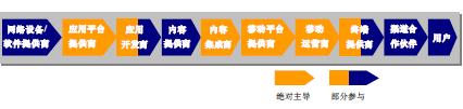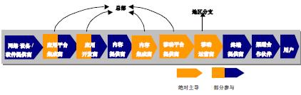 3G時代的移動通信產(chǎn)業(yè)鏈由技術(shù)平臺提供商、設(shè)備提供商、應(yīng)用平臺提供商、應(yīng)用開發(fā)商、內(nèi)容提供商、內(nèi)容集成商、移動平臺提供商、移動運(yùn)營商、終端提供商、渠道合作伙伴等市場主體構(gòu)成。移動通信產(chǎn)業(yè)鏈?zhǔn)且粋整體功能鏈狀網(wǎng)絡(luò),構(gòu)成產(chǎn)業(yè)鏈的市場主體隨著移動通信技術(shù)、市場競爭情況以及用戶需求的變化而變化。移動運(yùn)營商在產(chǎn)業(yè)鏈上發(fā)揮的作用也是不同的,每當(dāng)產(chǎn)業(yè)鏈發(fā)生變化時,移動運(yùn)營商就需要重新進(jìn)行角色定位。
