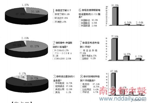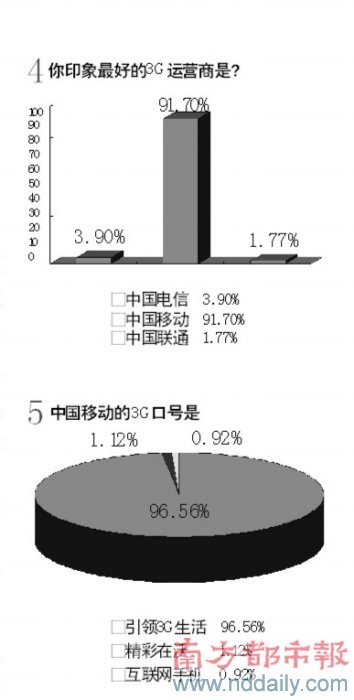 1、中國移動的3G口號是?超過98%的被訪者選擇了“引領(lǐng)3G生活”這一正確選項。2、你是否考慮升級到3G手機?選擇“會升級”的接近80%。如果考慮升級到3G手機,你最想使用哪家運營商的服務(wù)?中國移動奪得了超過九成的選票。但當最后問到,“你印象中,中國移動的3G標準是?”時,正確選項T D -SCD M A的得票率竟只有三成左右。