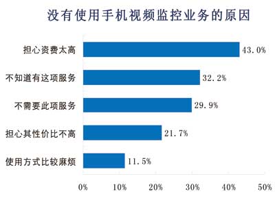 諾達(dá)咨詢對(duì)沒有使用手機(jī)視頻監(jiān)控的用戶原因進(jìn)行調(diào)查,結(jié)果表明,43%的用戶擔(dān)心資費(fèi)太高,其次對(duì)手機(jī)監(jiān)控不了解和不需要此項(xiàng)服務(wù)的用戶各占32%、30%。22%的用戶擔(dān)心性價(jià)比不高,12%用戶因?yàn)槭褂帽容^麻煩而不選擇手機(jī)視頻監(jiān)控服務(wù)。