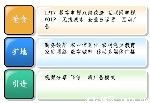 從廣義上講,廣電、電信、互聯(lián)網(wǎng)都屬于信息行業(yè),現(xiàn)在都面臨著自己在增長中遇到的問題,也就是滯漲。滯漲逼迫大家必須去轉(zhuǎn)型,轉(zhuǎn)型現(xiàn)在有三種方式,一個(gè)是搶,一個(gè)是擴(kuò),一個(gè)是引進(jìn)。從最近會(huì)議上來看,目前大家對搶食比較感興趣,畢竟有現(xiàn)成的一碗紅燒肉已經(jīng)做好了,對后面兩個(gè),相對來說談得還比較少,因?yàn)楹竺鎯蓚(gè),需要引入一些創(chuàng)新的技術(shù),引入創(chuàng)新的思維。