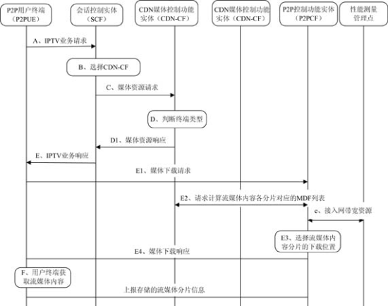 - 獲得相關(guān)信息后,P2PCF根據(jù)接入網(wǎng)資源占用情況、從CDN-CF獲取的CDN-MF列表、存儲(chǔ)相關(guān)資源的P2P終端狀態(tài),生成供P2PUE下載節(jié)目片段的列表。
