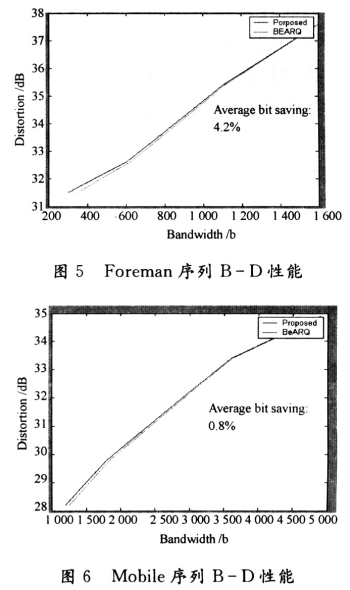 將圖4~圖6對比可以看出,對于運動程度很低且紋理相對平緩的Akiyo序列來說,相對盡力而為ARQ機制,本文的機制在3%的丟包情形下可以節(jié)省20%以上的帶寬。而對運動較為劇烈的Foreman序列來說,則只能節(jié)省4%的帶寬。對紋理很復雜的Mobile序列,本文的算法相對于BEARQ,帶寬僅節(jié)省不到1%。從表1的重發(fā)率和圖4~圖6的對應關系不難看出,重發(fā)率越高,則對應B-D性能的改善程度就越低。因此可以說實驗仿真表明了本文提出的傳輸控制算法,能夠在保證視頻接收質量的同時,有效降低傳輸所用帶寬。