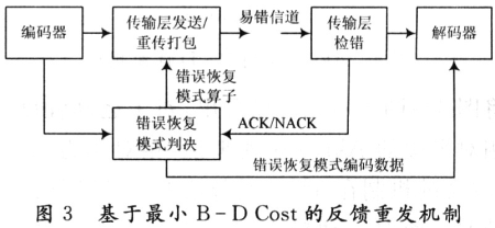 式中:rg是指出錯的部分被正確重傳到接收端的比特數(shù)。當r0≥(1-p)r+pr/(1-p)時,所有出錯的比特都實現(xiàn)了重傳,所以終端接收失真等于編碼端失真。否則,則按照式(7)中的兩個關系式,即可得到d0關于r0的表達式(5)。確立了上述關系后,結合相關的容錯平臺,設計出基于B-DCost的反饋重發(fā)機制,其原理框圖如圖3所示。