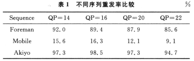 為了更全面評價本算法的性能,對不同測試序列在同樣丟包率情況下對本章的機制進行性能測試?紤]到影響本章算法性能的包括序列的紋理復雜程度以及運動劇烈程度。這里利用運動較為劇烈但紋理相對較單一的Foreman序列,紋理復雜程度較高的Mobile以及運動程度較低的Akiyo序列作為評測序列。表1是對這三個測試序列在QP=14,16,20,22,丟包率為3%的情況下前100幀做的統(tǒng)計,其中出錯Slice個數(shù)為24,則出錯宏塊總數(shù)為24×11=264。令NMB=264,則根據(jù)模式判決結果,即可得到對重發(fā)率的統(tǒng)計。