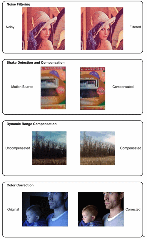 圖: 四種預(yù)處理算法示例:噪聲濾波、抖動(dòng)檢測(cè)與補(bǔ)償、動(dòng)態(tài)范圍補(bǔ)償和顏色校正。