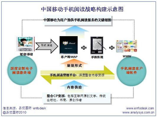 易觀國(guó)際(Analysys International)分析認(rèn)為,中國(guó)移動(dòng)發(fā)展手機(jī)閱讀的整體思路是基于渠道資源,縱貫內(nèi)容、終端以強(qiáng)勢(shì)整合手機(jī)閱讀的產(chǎn)業(yè)鏈。將原有的手機(jī)閱讀的短信/彩信形式演變?yōu)榭蛻?hù)端軟件/WAP、手持終端、WWW的形式,最終為用戶(hù)提供手機(jī)閱讀的無(wú)縫鏈接體驗(yàn)。