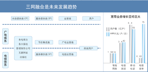 蘇少林:三網融合的推進對于我國在“后危機時代”拉動國內消費、形成新的經濟增長點有著積極的意義。據(jù)測算,三網融合可帶動6000億元~7000億元的投資和消費,還可增加20萬個就業(yè)崗位,由此推動的固網寬帶業(yè)務將拉動GDP增長0.8個百分點。因此,電信監(jiān)管部門要站在大力推動信息產業(yè)和文化產業(yè)發(fā)展、提高國民經濟和社會信息化水平、滿足人民群眾日益多樣的生產和生活服務需求的高度上來推進三網融合。