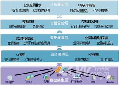 業(yè)務(wù)建模層: 是整個(gè)監(jiān)控系統(tǒng)的核心,是將業(yè)務(wù)進(jìn)行有形化管理、量化衡量的高效手段。該業(yè)務(wù)建模層中涵蓋了幾乎所有的BOSS管理資源要素,包括業(yè)務(wù)、應(yīng)用、服務(wù)及其他平臺(tái)類(lèi)資源,這些信息都建立并實(shí)時(shí)更新于企業(yè)集中建設(shè)的符合ITIL標(biāo)準(zhǔn)的CMDB(配置資源數(shù)據(jù)庫(kù),其中每一子項(xiàng)便是一個(gè)CI配置資源項(xiàng))中;贑MDB中動(dòng)態(tài)調(diào)整的實(shí)時(shí)CI項(xiàng)和相互關(guān)系,關(guān)聯(lián)上能夠反映業(yè)務(wù)當(dāng)前狀況的KPI指標(biāo),以結(jié)構(gòu)化的模型框架為指導(dǎo),建立完整的業(yè)務(wù)CI/KPI指標(biāo)體系,繪制出以業(yè)務(wù)為中心的BOSS系統(tǒng)視圖,全面展現(xiàn)其健康度和可用性。