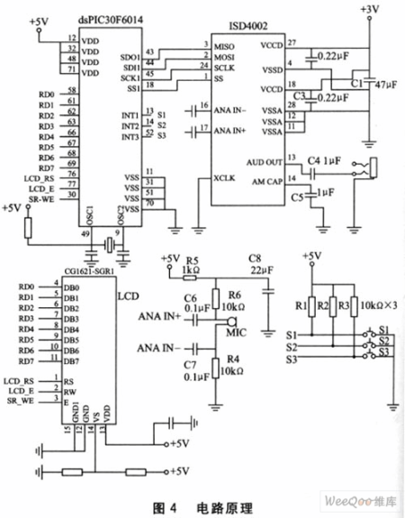 電路原理如圖4所示。整個(gè)電路由語音錄放電路、話筒輸入電路、按鍵開關(guān)電路及LCD顯示電路構(gòu)成。由于本設(shè)計(jì)輸出直接驅(qū)動(dòng)普通耳機(jī),經(jīng)實(shí)驗(yàn)不需外部功放電路,直接利用ISD4002內(nèi)部功放輸出即可。ISD4002作為從機(jī),其SPI接口的MOSI接控制器的SDO;MISO接控制器的SDI;SCLK接SCK;SS接控制器的SS即可。LCD用于人機(jī)交互的界面顯示。