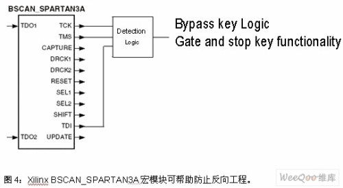 平臺中, 可在設(shè)計中使用BSCAN_SPARTAN3A宏模塊,其檢測邏輯可監(jiān)控FPGA構(gòu)造中的JTAG控制信號,如圖4所示。如果檢測到JTAG控制信號的活動,用戶在設(shè)計可以立即繞過關(guān)鍵邏輯或關(guān)斷關(guān)鍵功能,不再執(zhí)行正確的功能。這樣反向工程人員讀到的將是不正確的功能模塊,在不能完成預(yù)期功能的解決方案上浪費(fèi)時間和資源。