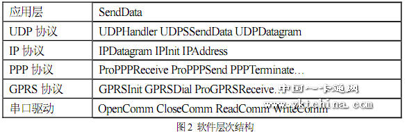程序中的所有代碼都是由C 語(yǔ)言編寫的,并采用分層的結(jié)構(gòu),從底到上分別為:串口驅(qū)動(dòng)層、GPRS 模塊驅(qū)動(dòng)層、PPP 協(xié)議層、IP 協(xié)議層、UDP 協(xié)議層與應(yīng)用層。上層函數(shù)的實(shí)現(xiàn)需要應(yīng)用到底層函數(shù),而底層函數(shù)的任務(wù)就是為上層函數(shù)提供服務(wù),最終完成應(yīng)用層任務(wù)——傳送數(shù)據(jù)。各層的主要函數(shù)如圖2 所示: