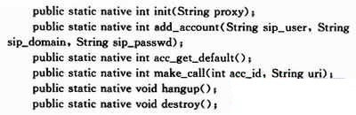 由于Java中的數(shù)據(jù)類型與C/C++不盡相同,因此還必須注意參數(shù)傳遞時參數(shù)類型的轉(zhuǎn)換。本文所涉及到的Java數(shù)據(jù)類型有String和int型,Javah生成的頭文件中會先定義好需要傳遞的參數(shù)類型以及函數(shù)返回類型,例如方法“add_account(String sip_user,Stringsip_dom-ain,String sip_passwd)”,在頭文件中將定義函數(shù)的形式為“JNIEXPORT jint JNICALL Java_com_android_IMSandroid_pjsip_add_lac-count(JNIEnv*,jclass,jstring,jstring,jstring)”,其中JNIEXPORT為JNI外部函數(shù)聲明,jint是“jni.h”中定義C語言中整形的對應(yīng)類型,JNCALL是JNI關(guān)鍵字。比較特殊的是JNIEnv,它是一個指向類型為JNIEnv_的一個特殊JNI數(shù)據(jù)結(jié)構(gòu)的指針,它的每個元素都指向一個JNI函數(shù)的指針,jclass會根據(jù)引用Java類的不同而不同,本文中“pjsip.class”是靜態(tài)類,因此這里的jclass指的是類本身,如果是非靜態(tài)類則指的是對象。后面幾個就是pjsip類需要傳遞的參數(shù),根據(jù)“jni.h”的定義,String類型對應(yīng)jstring,int對應(yīng)jint。然而這只是函數(shù)申明與類中方法的形式對應(yīng),參數(shù)的具體傳遞還需要相應(yīng)的轉(zhuǎn)化,具體實現(xiàn)將在下一節(jié)詳細(xì)介紹。