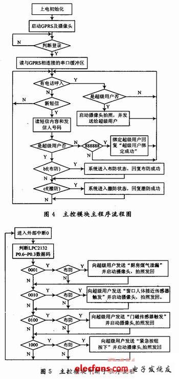 在主控模塊主程序中系統(tǒng)一直在檢測是否有來電和新短信信息,當有來電時系統(tǒng)會自動掛斷電話,然后判斷是不是超級用戶:是,啟動攝像頭拍照,并發(fā)送給超級用戶;不是,系統(tǒng)將不理睬,繼續(xù)檢測。當是短消息時,判斷是否是超級用戶:不是,判斷短信內(nèi)容是“888888 ”否,是則系統(tǒng)綁定該號碼為超級用戶,并回復(fù)“超級用戶綁定成功”;是,判斷短信內(nèi)容是否是“bf”或“cf”,是“bf”系統(tǒng)進入布防狀態(tài),并回復(fù)“布防成功”,是“cf”系統(tǒng)撤防,回復(fù)“撤防成功”。