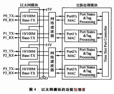 以太網(wǎng)模塊的功能連接圖如圖4所示,進(jìn)出以太網(wǎng)接口的信號都需要經(jīng)過網(wǎng)絡(luò)濾波器,網(wǎng)絡(luò)濾波器實(shí)質(zhì)上是一個選頻電路,它的功能就是允許某一部分頻率的信號順利的通過,而另外一部分頻率的信號則受到較大的抑制。與網(wǎng)絡(luò)濾波器相連的是交換處理模塊中的Port's MAC(M-edia Access Controllers),用來解決在共用信道中產(chǎn)生競爭時分配信道的使用權(quán)問題。
