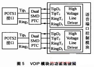 VOIP模塊的功能連接圖如圖5所示。Dual SMD PTC叫做雙重?zé)崦綦娮,可對過熱和過流雙重作用導(dǎo)致的電路故障進(jìn)行保護(hù);Tip and Ring(正極線和負(fù)極線)表示組成電話配線電路的兩條電線,Tip是正極線的別稱,Ring是負(fù)極電線的別稱。