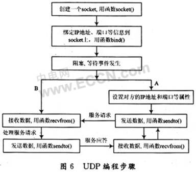 在本系統(tǒng)中,在一個(gè)網(wǎng)段內(nèi)的任意兩個(gè)應(yīng)用程序之間可以進(jìn)行全雙工通信,每個(gè)應(yīng)用程序既可做為服務(wù)器又可做為客戶端。其UDP編程步驟如圖6所示,以下是兩個(gè)應(yīng)用程序A和B之間進(jìn)行點(diǎn)對(duì)點(diǎn)通訊的具體實(shí)現(xiàn)過(guò)程: