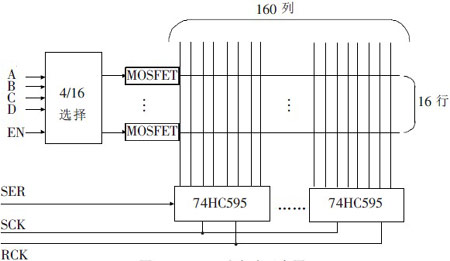 本系統(tǒng)采用行掃描方式,行選通電路由集成電路74HC154構(gòu)成。74HC154是4線-16線高性能譯碼器,在點(diǎn)陣屏幕不大的情況下,一般的單片機(jī)可以直接驅(qū)動(dòng)點(diǎn)陣LED的亮滅,但是考慮擴(kuò)展為大屏幕尺寸時(shí),因單片機(jī)的I/O口不足以提供足夠的驅(qū)動(dòng)電流,但可在74HC154和點(diǎn)陣的行接口接上一個(gè)PNP型8550三極管開關(guān)電路用來提供足夠的電流,當(dāng)74HC154發(fā)出低電平時(shí),三極管Q導(dǎo)通,輸出高電平。此外,可用帶有2級(jí)鎖存移位輸出功能的74HC595鎖存器來對(duì)列線進(jìn)行驅(qū)動(dòng)控制。LED點(diǎn)陣的列線接到74HC595的8bit并行輸出口上,由單片機(jī)控制數(shù)據(jù)的輸出,利用74HC595的鎖存輸出功能,電路共用同一個(gè)移位時(shí)鐘SCK和數(shù)據(jù)鎖存時(shí)鐘RCK,可級(jí)聯(lián)多片74HC595以構(gòu)成更大LED點(diǎn)陣屏的列驅(qū)動(dòng)電路。此結(jié)構(gòu)還可在75HC595的使能端通過PWM波進(jìn)行灰度調(diào)節(jié)。以一個(gè)16行×160列的LED點(diǎn)陣單元為例,本系統(tǒng)采用的驅(qū)動(dòng)電路原理如圖所示。