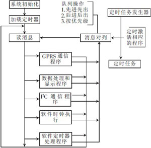 該下位機(jī)軟件設(shè)計(jì)包括主程序、顯示子程序和通信服務(wù)程序的設(shè)計(jì)。主程序主要完成中斷的初始化和串口的初始化設(shè)置。顯示程序主要完成數(shù)據(jù)的各種顯示,顯示部分采用動(dòng)態(tài)掃描的方式,實(shí)現(xiàn)對(duì)顯示屏要顯示的漢字、圖像、字符等數(shù)據(jù)信息進(jìn)行傳輸控制以及顯示等功能。通信服務(wù)程序主要完成GPRS的數(shù)據(jù)接收、數(shù)據(jù)的分割處理、數(shù)據(jù)的發(fā)送等任務(wù)。本文采用模塊化程序設(shè)計(jì),程序各部分的功能由各個(gè)模塊分別實(shí)現(xiàn)。程序模塊有:系統(tǒng)初始化模塊、GPRS通信模塊、數(shù)據(jù)的處理和存儲(chǔ)模塊、I2C通信模塊。為了保證系統(tǒng)工作的實(shí)時(shí)性和高效性,本系統(tǒng)采用了實(shí)用單片機(jī)系統(tǒng)MS3,MS3是一套針對(duì)MCU51的開發(fā)平臺(tái),借簽了VC編程的消息機(jī)制,把各個(gè)功能有效地組織起來。RTOS的系統(tǒng)時(shí)鐘,實(shí)現(xiàn)高效的按鍵掃描和快速的響應(yīng)中斷,執(zhí)行例行程序。顯示終端主程序如圖所示。