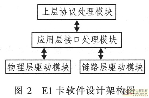 E1采集卡軟件設(shè)計架構(gòu)主要由鏈路層驅(qū)動模塊、物理層驅(qū)動模塊、應(yīng)用層接口處理模塊和上層協(xié)議處理模塊組成,如圖2所示。驅(qū)動程序是數(shù)據(jù)采集卡的基礎(chǔ),它負(fù)責(zé)E1接口數(shù)據(jù)采集和數(shù)據(jù)重組,并通過共享內(nèi)存與PC機(jī)實現(xiàn)數(shù)據(jù)交互,以及控制指令動作和硬件狀態(tài)報告等。