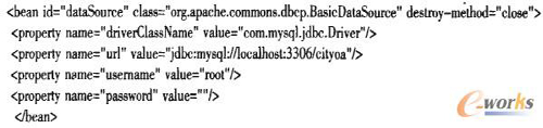 與本地開發(fā)不同的是云計算平臺下,由于服務(wù)器采用虛擬主機(jī)技術(shù),無法像本地服務(wù)器那樣配置數(shù)據(jù)庫連接池,因此需要CRM系統(tǒng)自己管理數(shù)據(jù)庫連接池。本系統(tǒng)使用Spring管理下的數(shù)據(jù)庫連接池,運用Apache開源DBCP框架配置連接池代碼如下: