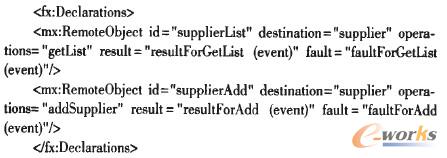 客戶層采用Flex4的Spark UI組件和ActionScript分別實現(xiàn)MVC模式的View和Control層,實現(xiàn)與系統(tǒng)用戶的交互,并通過Spring BalazeDs集成框架發(fā)布的Remote Object,實現(xiàn)與業(yè)務(wù)層對象的通訊,進(jìn)而完成CRM業(yè)務(wù)處理。如下代碼為Flex中聲明Remote Object:
