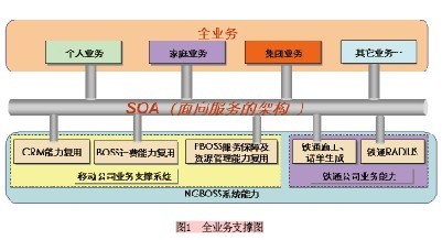 為了適應(yīng)全業(yè)務(wù)競爭的需要,長遠(yuǎn)規(guī)劃業(yè)務(wù)支撐系統(tǒng),移動(dòng)采用SOA(Service Oriented architecture,面向服務(wù)的架構(gòu))技術(shù)對(duì)業(yè)務(wù)支撐系統(tǒng)進(jìn)行了改造,并把鐵通資源融合進(jìn)SOA架構(gòu),改造項(xiàng)目以業(yè)務(wù)支撐系統(tǒng)SOA架構(gòu)為基礎(chǔ),進(jìn)行寬帶業(yè)務(wù)合營和IPPBX固話業(yè)務(wù)合營,構(gòu)建基于SOA架構(gòu)的一體化服務(wù)營銷支撐體系。