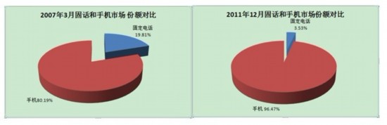 手機(jī)的增長非常顯著,從2007年開始,手機(jī)用戶每年以42.7%的速度增長。手機(jī)的市場份額從2007年的80.19%增加到2011年12月的96.47%,現(xiàn)在已經(jīng)遠(yuǎn)遠(yuǎn)超過了固話。