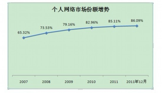 印度政府開放市場的努力收效明顯,表現(xiàn)在個人業(yè)務(wù)市場份額的增加,F(xiàn)在個人業(yè)務(wù)在電信服務(wù)擴(kuò)張中起著重要作用。最新數(shù)據(jù)顯示,到2011年12月,個人用戶在電話用戶總量中的比重已達(dá)86.09%,而1999年3月,這一數(shù)字僅為5.35%。
