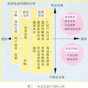 ——圖2表示以電話營銷的目的及對象為軸分析電話營銷的應(yīng)用?v軸為對象,分為“特定”和“不特定”,橫軸為目的,分為“服務(wù)”和“銷售”。這樣右上區(qū)域=“特定對象X服務(wù)”,即為客戶服務(wù),右下區(qū)域=“不特定對象X服務(wù)”,對應(yīng)信息咨詢;左側(cè)為銷售。從對象來看,服務(wù)更偏重于“特定對象”。從目的來看,訂購/預(yù)約受理是最直接的銷售行為,所以放在最左,銷售支持在中間,促銷活動靠右。