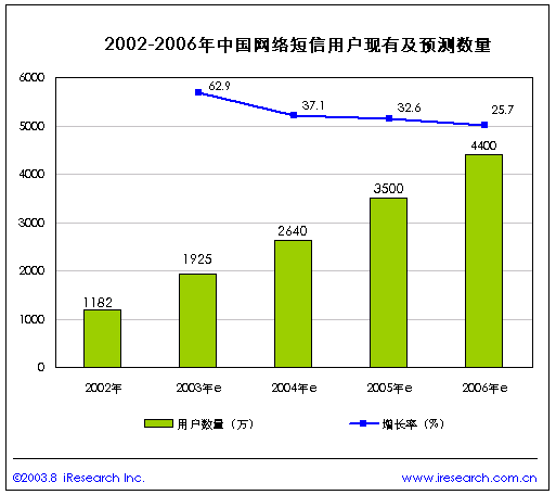 上海艾瑞市場(chǎng)咨詢有限公司是一家專注于網(wǎng)絡(luò)媒體、網(wǎng)絡(luò)營(yíng)銷等網(wǎng)絡(luò)經(jīng)濟(jì)領(lǐng)域的專業(yè)市場(chǎng)調(diào)研機(jī)構(gòu)。公司近期發(fā)布《2003年中國(guó)網(wǎng)絡(luò)短信研究報(bào)告》,該報(bào)告中根據(jù)中國(guó)的網(wǎng)絡(luò)經(jīng)濟(jì)發(fā)展情況預(yù)測(cè):2003年中國(guó)網(wǎng)絡(luò)短信用戶將達(dá)到1925萬,2004年將達(dá)到2640萬。