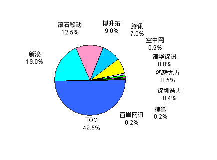 從國內(nèi)移動IVR市場第一季度各SP的收入情況看,一季度收入超過千萬的只有TOM和新浪。其中TOM平均月收入超過1000萬;新浪平均月收入在480萬左右。從市場份額來看,TOM遙遙領先,接近50%的市場份額;其次是新浪,占到19%的市場份額。滾石移動和博升拓是最早進入移動IVR市場的SP之一,市場份額分別為12.5%和9%左右;騰訊由于其特殊的用戶資源,雖然進入移動IVR市場的時間相對稍晚一點,但業(yè)務增長很快,市場份額在7%左右。通過對各SP移動IVR市場份額的分析可以看出,目前移動IVR業(yè)務的市場集中度相對較高,以上這五家SP占到總市場份額的97%左右。