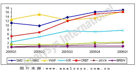 短信業(yè)務的市場規(guī)模為17.08億,比上個季度小幅增長5.4%。雖然 WAP 業(yè)務和 CRBT 業(yè)務的市場規(guī)模和短信業(yè)務非常接近,但是短信業(yè)務仍然是移動增值業(yè)務中比重最大的一塊。更為重要的是,短信業(yè)務仍然是