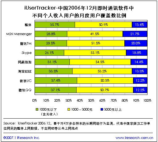 根據(jù)iResearch艾瑞市場(chǎng)咨詢最新推出的網(wǎng)民連續(xù)用戶行為研究系統(tǒng)iUserTracker的最新數(shù)據(jù)表示,2006年12月,即時(shí)通訊軟件的月度總覆蓋用戶數(shù)為10183萬(wàn)人,比2006年11月上升了0.8%,其中使用騰訊QQ的用戶最多,占94%,MSN Messenger排名第二,占35.6%,淘寶旺旺排名第三,占29%。在最近四個(gè)月內(nèi),即時(shí)通訊類(lèi)軟件的月度總覆蓋用戶數(shù)總體保持增長(zhǎng)。